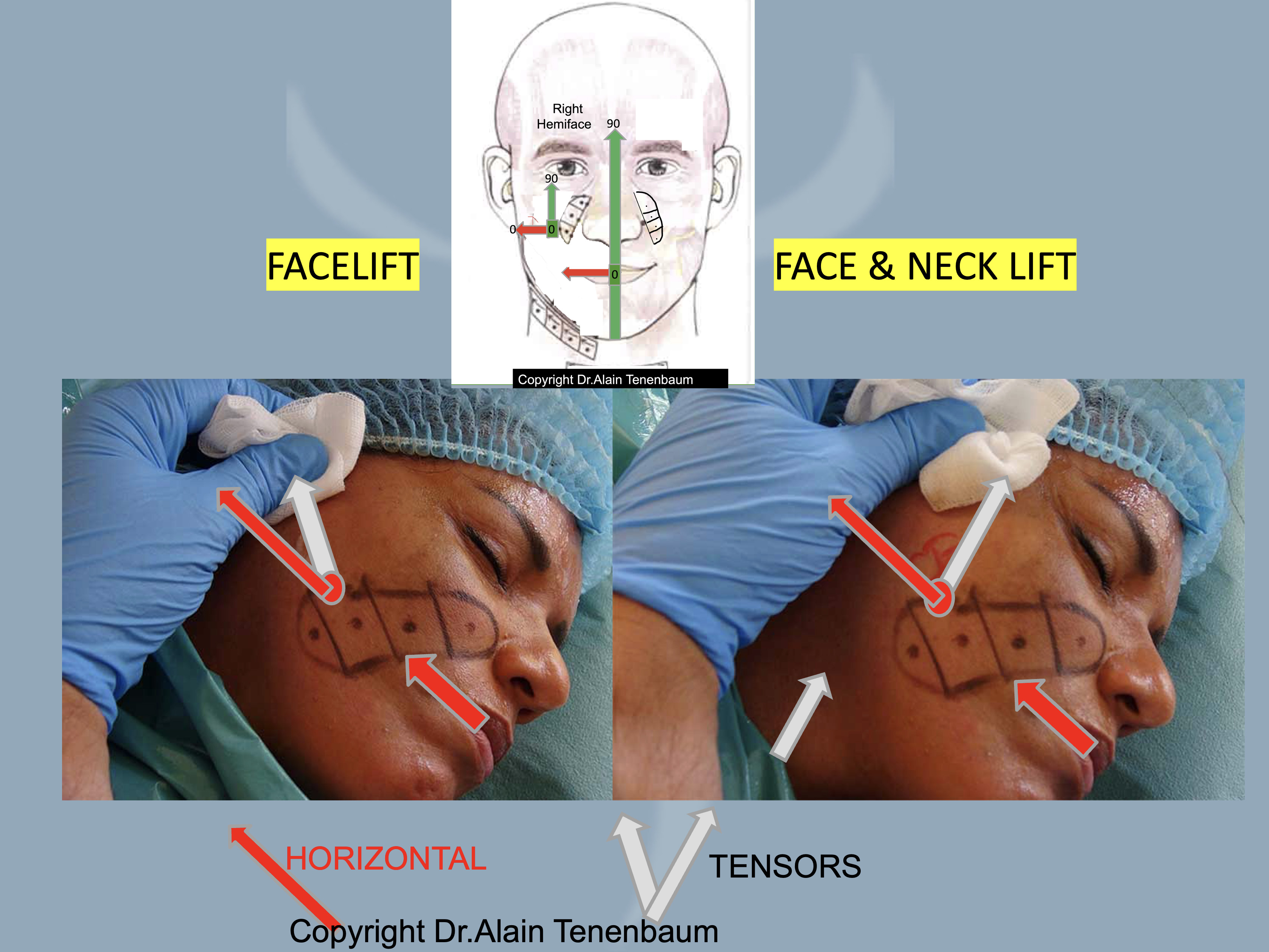 - For face+neck lift, the angle between the tensor of the lower quadrant and the horizontal is here a little bit less than 90 grades. ( It should be bewteen 45 and 90 grades).